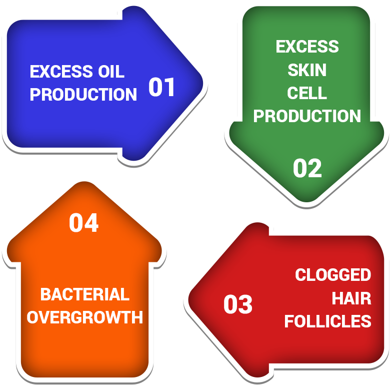 While we still have a lot more to learn about what causes acne, here are the four main steps we believe are at the heart of acne: